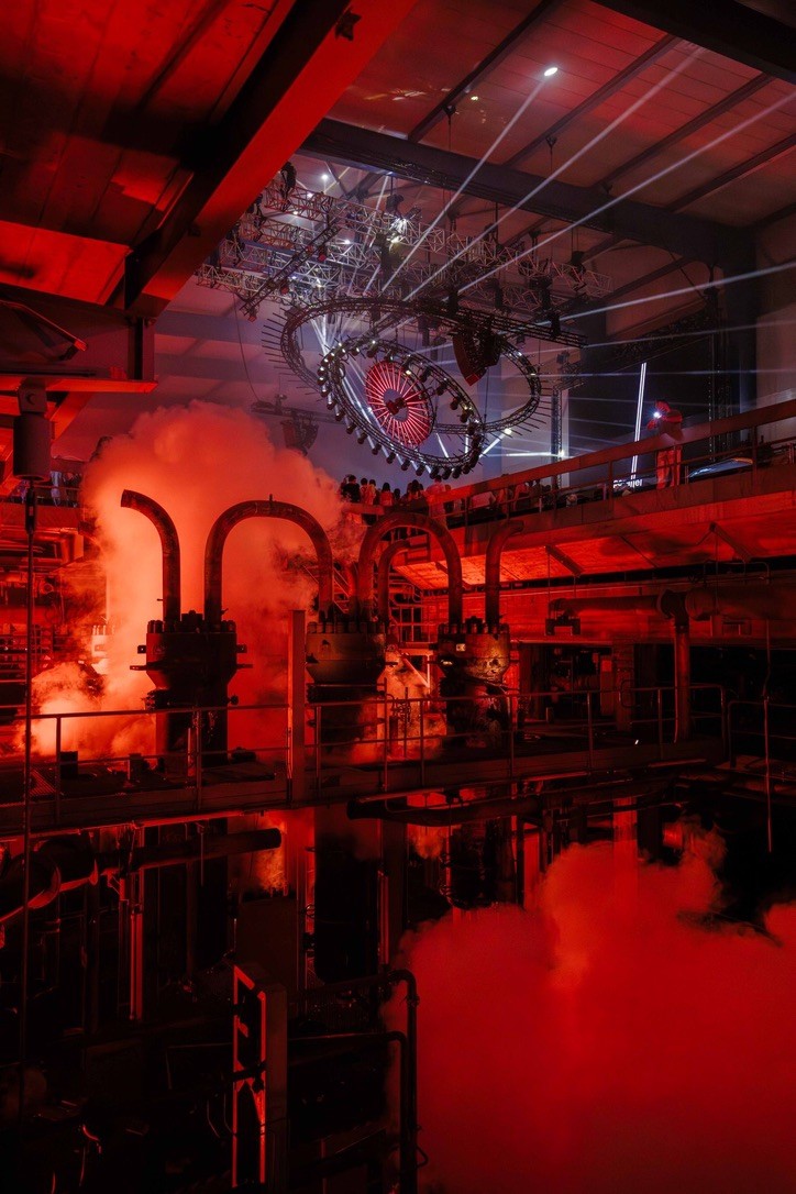 Our approach treated the building as a dormant machine waiting to be reactivated. Subtle layers of light and haze threaded through the original pipes, turbines, and steel structures, suggesting hidden systems flickering back to life. The architecture became a living backdrop — industrial, atmospheric, and quietly monumental.
