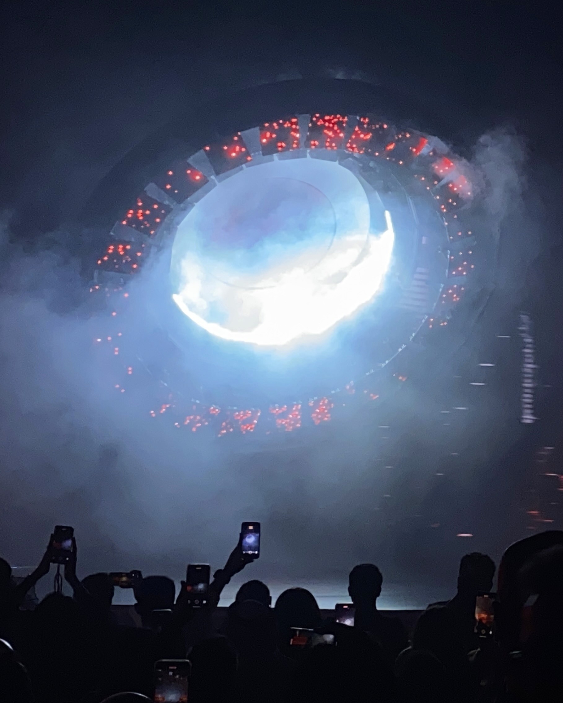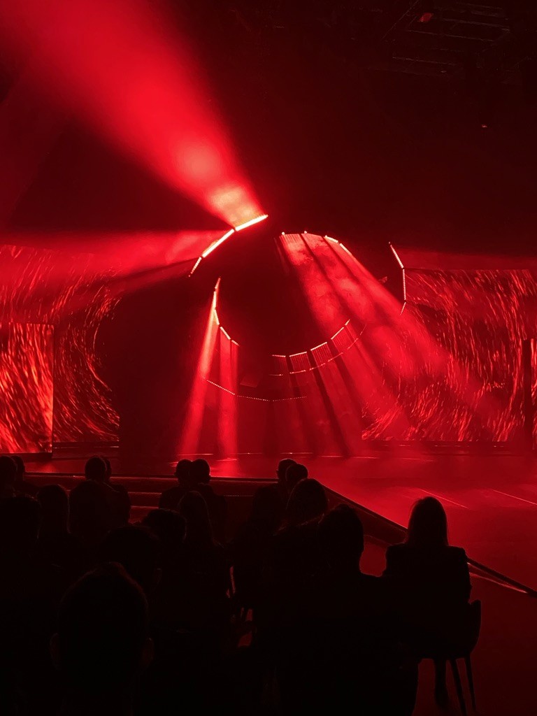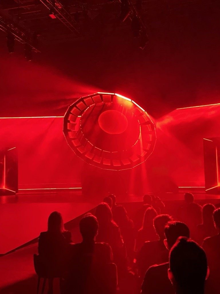 The scenography centred around a large circular lighting form, conceived as an abstract engine core — the source from which all visual energy flowed. Light beams, motion, and graphic content radiated from this structure, creating a sense of mechanical force and controlled power throughout the space.